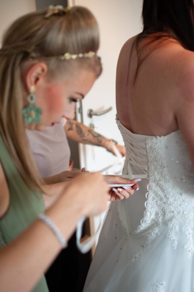 Das Fertig machen der Braut gemeinsam mit ihren Trauzeuginnen/Freundinnen oder Familienmitgliedern . Hier kann man sehen, wie erst alle entspannt sind, doch sobald das Brautkleid angezogen wurde die Emotionen alles überrollen. Da kommen die ersten Tränen, das aufgeregt sein & die Anspannung steigt.
