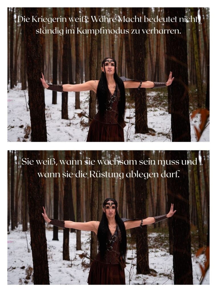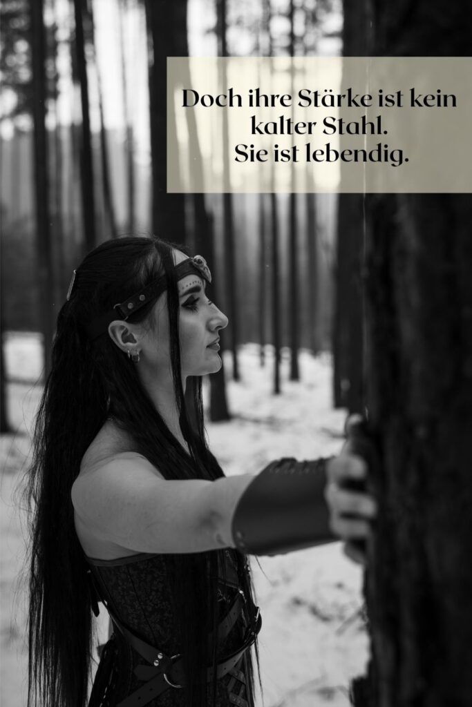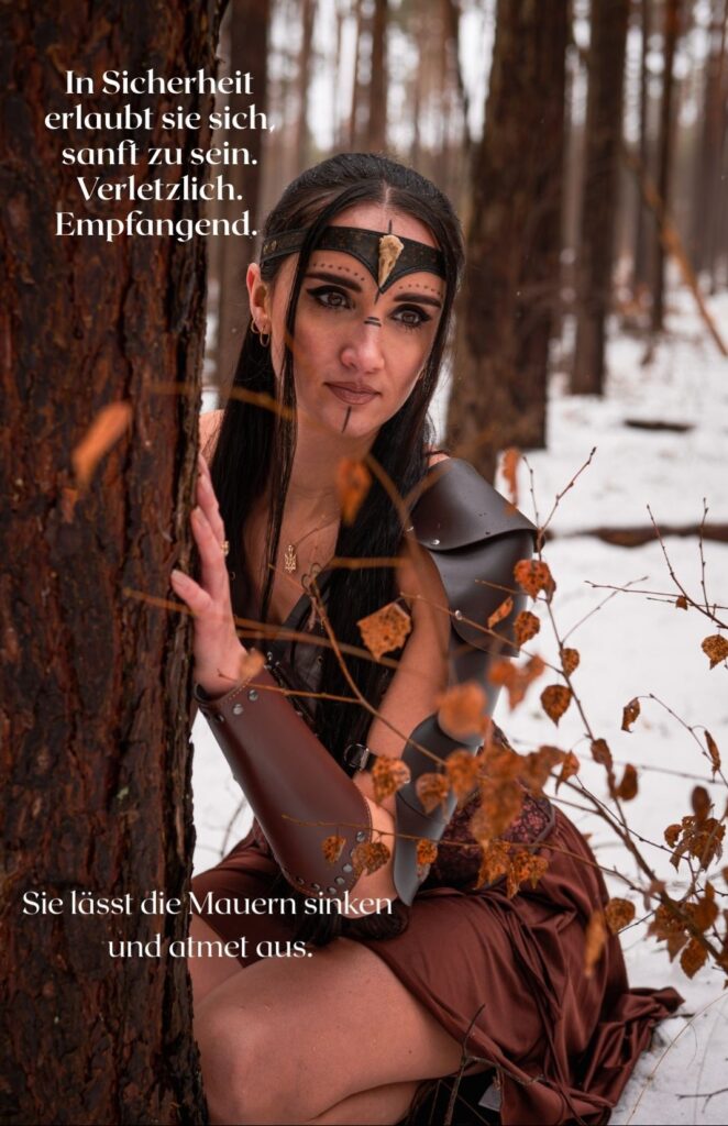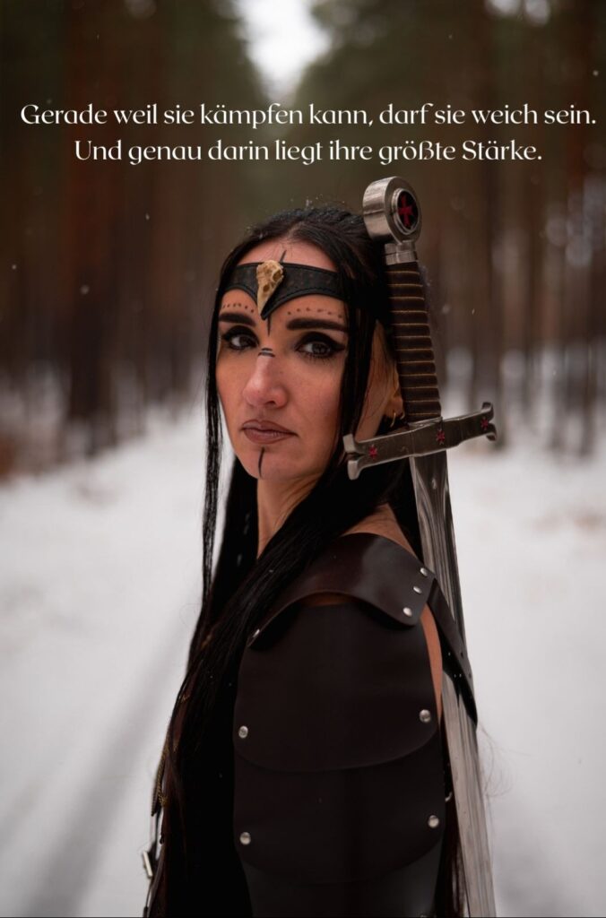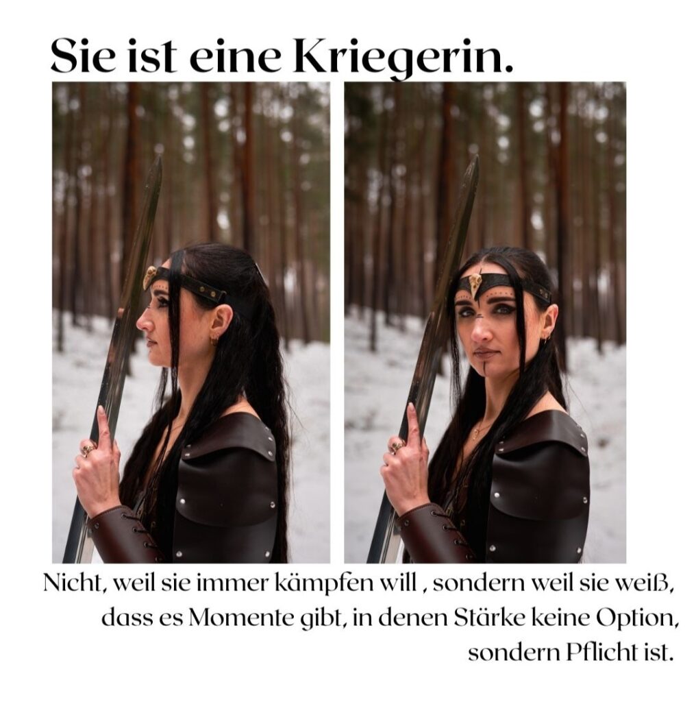 Nicht laut. Nicht kämpfend gegen die Welt. Sondern eine, die steht. Für sich & ihre Wahrheit. Für ihren Weg. Sie trägt keine Rüstung aus Stahl, sondern aus Erfahrung. Sie zeigt Stärke, die nicht schreit, sondern wirkt.